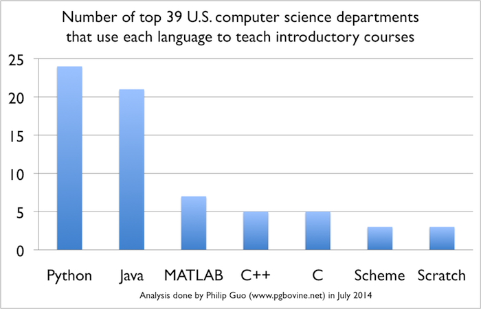 下面的图示统计显示:Python现在成为美国名校中最流行的编程入门语言。
