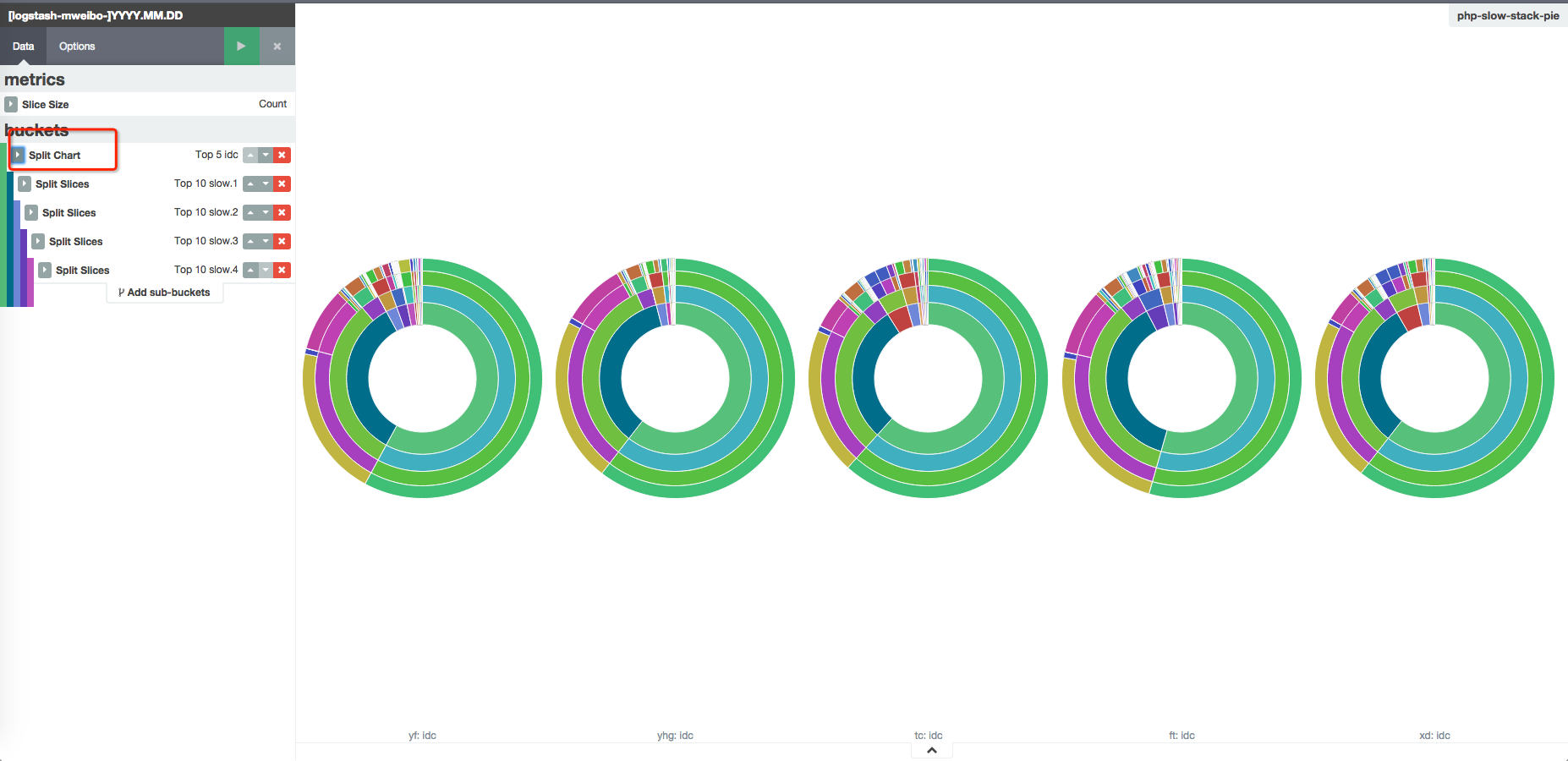 上一节我们展示了 sub aggs 在饼图上的效果。不过这多层 agg,其实用的是同一类数据。如果在聚合中,要加上一些完全不同纬度的数据,还是在单一的图片上继续累加就不是很直观了。比如说,还是上一节用到的 PHP 慢函数堆栈。我们可以根据机房做一下拆分。由于代码部署等主动变更都是有灰度部署的,一旦发现某机房有异常,就可以及时处理了。