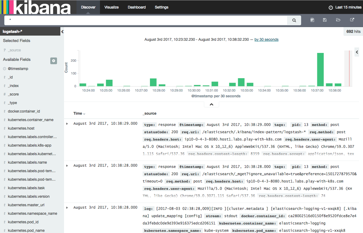 在使用 cluster/kube-up.sh 部署集群的时候,可以设置 KUBE_LOGGING_DESTINATION 环境变量自动部署 Elasticsearch 和 Kibana,并使用 fluentd 收集日志 (配置参考 addons/fluentd-elasticsearch):