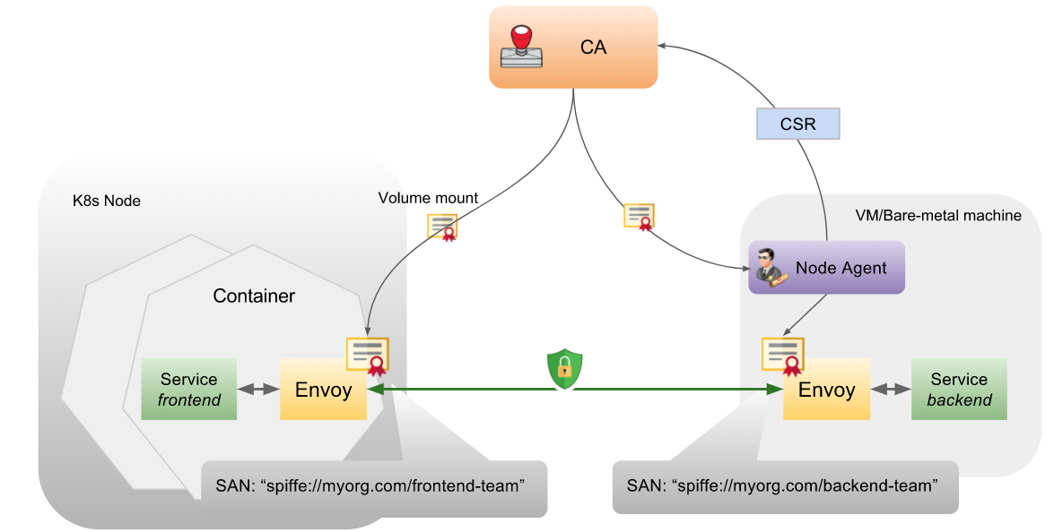 spiffe://<*domain*>/ns/<*namespace*>/sa/<*serviceaccount*> - 通信安全:端到端 TLS 通信通过服务器端和客户端的 Envoy 容器完成