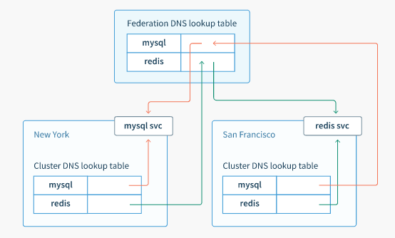 每个 Federation 有自己的分布式存储、API Server 和 Controller Manager。用户可以通过 Federation 的 API Server 注册该 Federation 的成员 K8s Cluster。当用户通过 Federation 的 API Server 创建、更改 API 对象时,Federation API Server 会在自己所有注册的子 K8s Cluster 都创建一份对应的 API 对象。在提供业务请求服务时,K8s Federation 会先在自己的各个子 Cluster 之间做负载均衡,而对于发送到某个具体 K8s Cluster 的业务请求,会依照这个 K8s Cluster 独立提供服务时一样的调度模式去做 K8s Cluster 内部的负载均衡。而 Cluster 之间的负载均衡是通过域名服务的负载均衡来实现的。