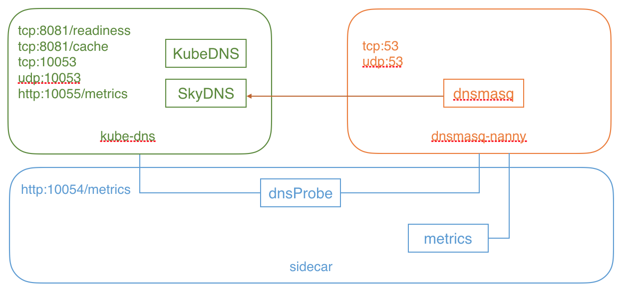 - SkyDNS 负责 DNS 解析,监听在 10053 端口 (tcp/udp),同时也监听在 10055 端口提供 metrics