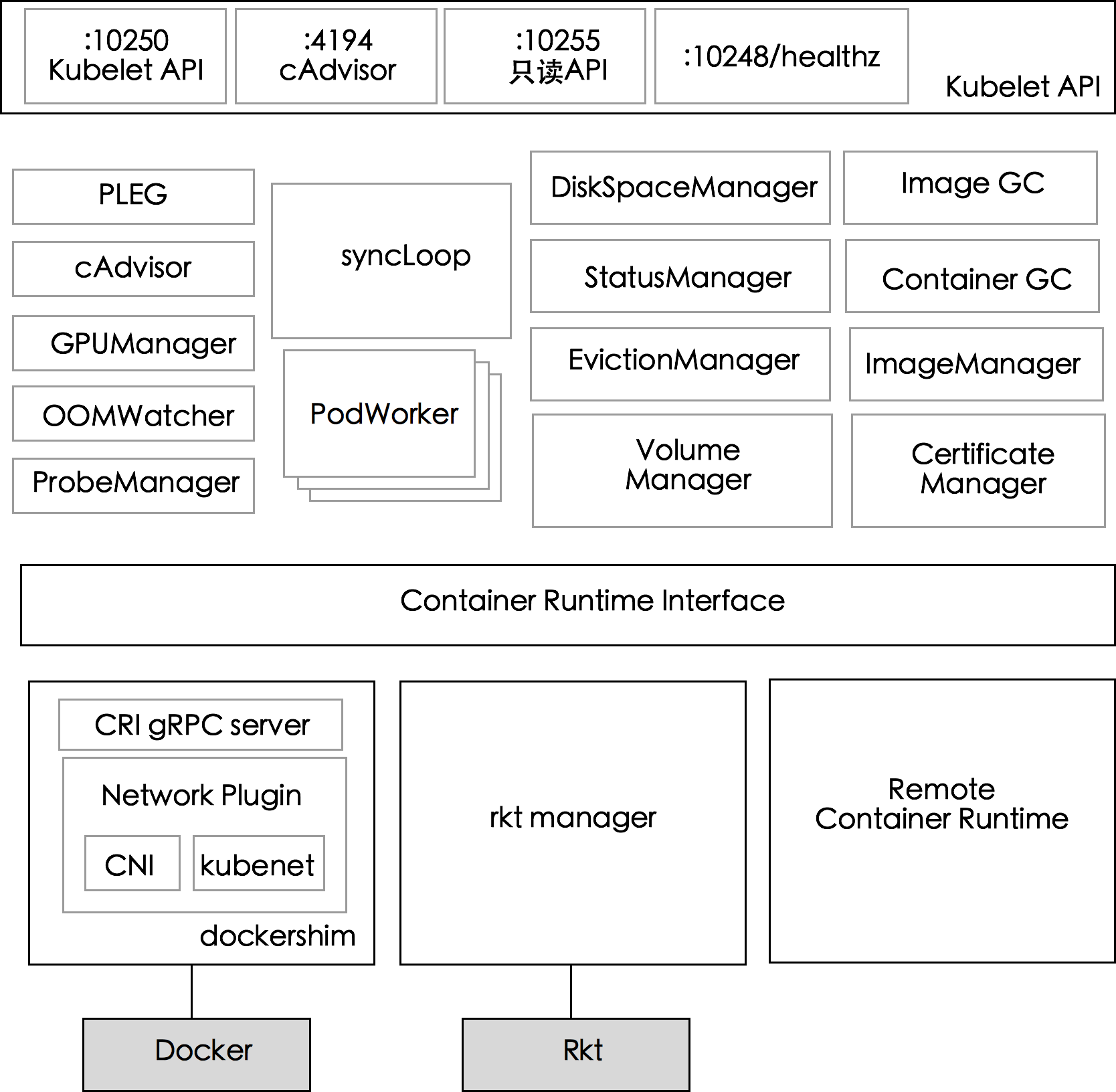 如下 kubelet 内部组件结构图所示,Kubelet 由许多内部组件构成