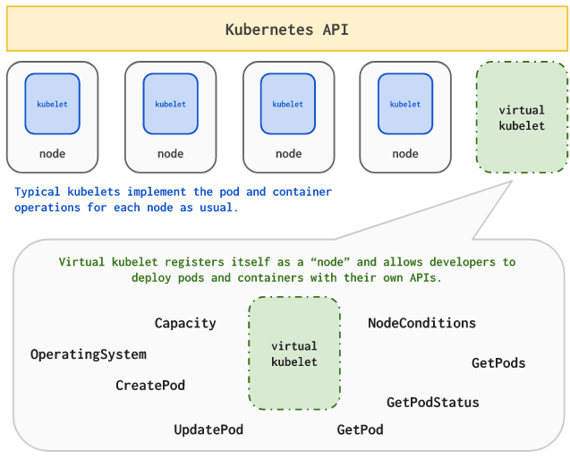 Azure 容器实例(ACI)提供了在 Azure 中运行容器的最简捷方式,它不需要用户配置任何虚拟机或其它高级服务。ACI 适用于快速突发式增长和资源调整的业务,但其本身的功能相对比较简单。 Virtual Kubelet 可以将 ACI 作为 Kubernetes 集群的一个无限 Node 使用,这样就无需考虑 Node 数量的问题,ACI 会根据运行容器自动管理集群资源。