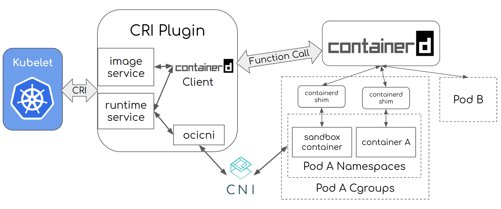 Containerd 内置的 CRI 插件实现了 Kubelet CRI 接口中的 Image Service 和 Runtime Service,通过内部接口管理容器和镜像,并通过 CNI 插件给 Pod 配置网络。