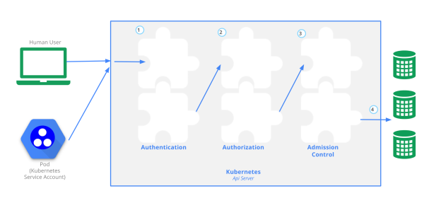 下图是 API 访问要经过的三个步骤,前面两个是认证和授权,第三个是 Admission Control。